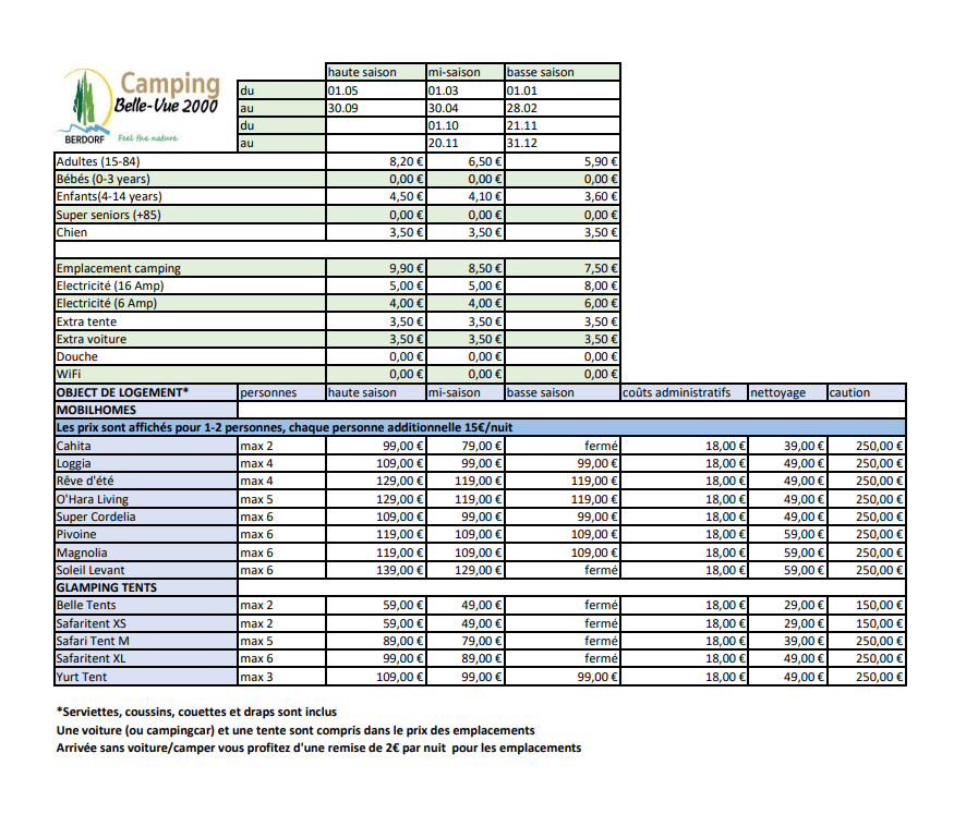 21 € par nuit (incluant 1 emplacement de camping avec 6AMP, 2 adultes et 1 chien ou animal de compagnie)